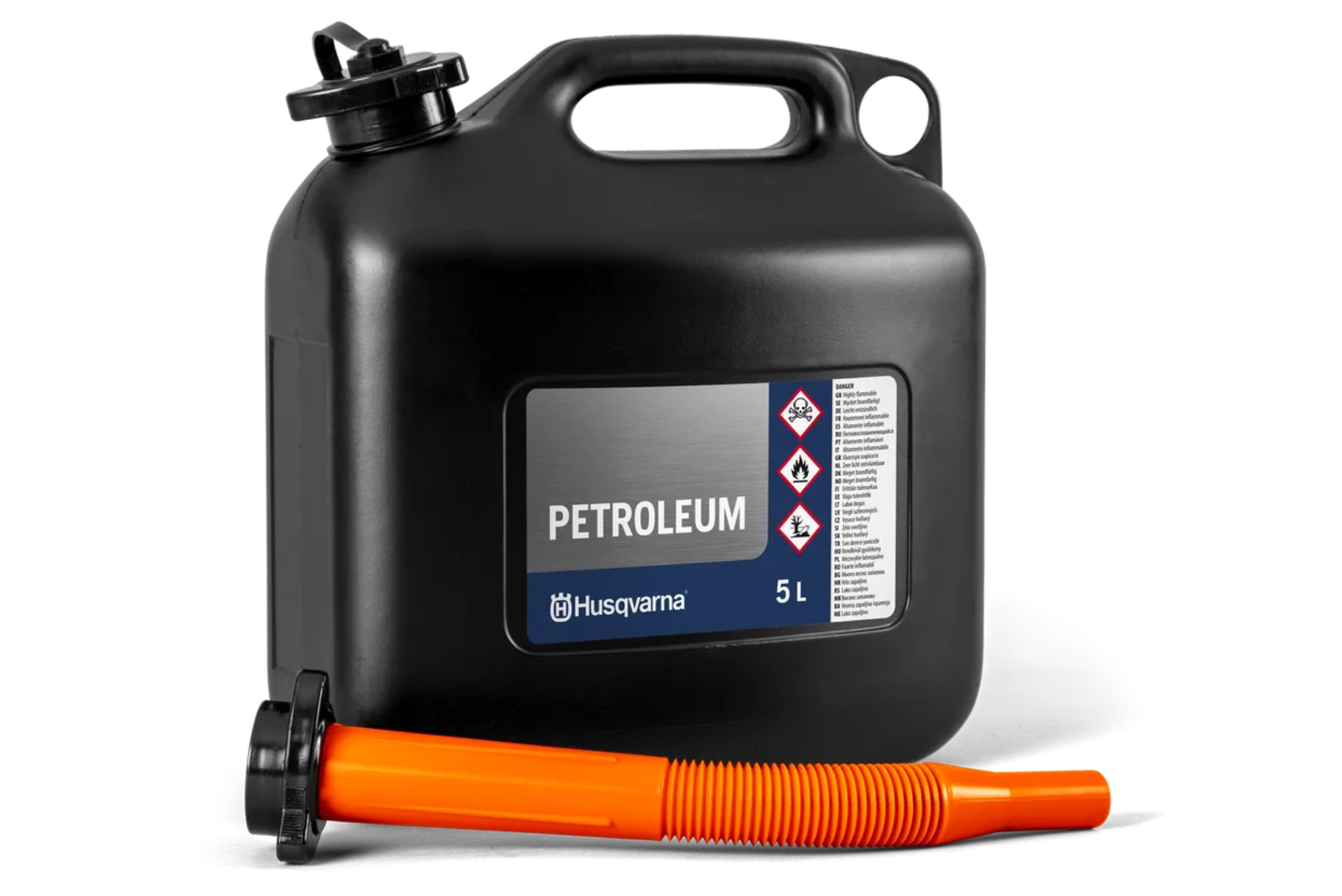 Ανθεκτικό δοχείο καυσίμου 5 λίτρων της Husqvarna με ενσωματωμένη λαβή που το καθιστά εύκολο στη μεταφορά. Συνοδεύεται από εύκαμπτο στόμιο για απρόσκοπτη πλήρωση με μειωμένο κίνδυνο τυχαίας έκχυσης.
