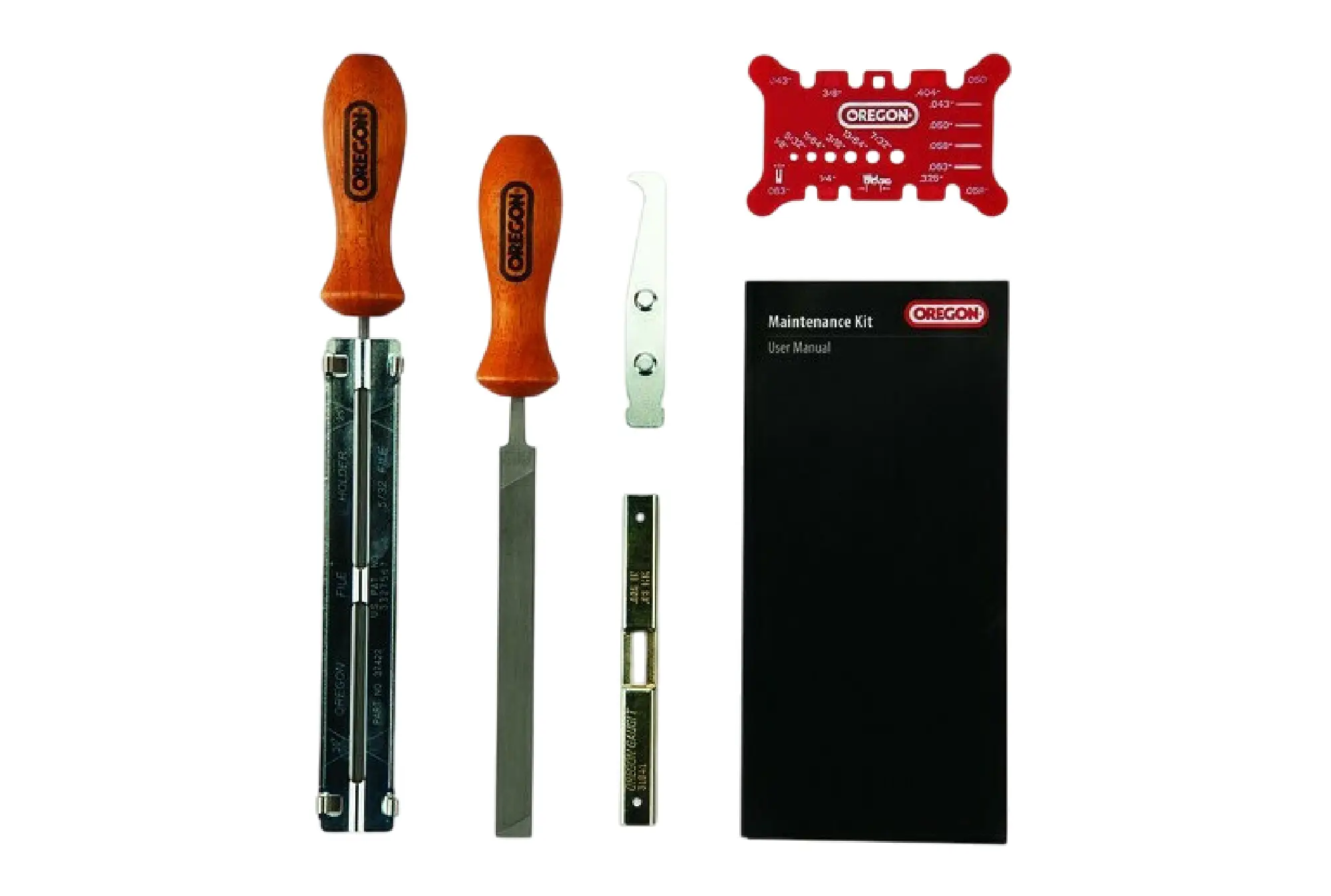 Συναρμολογημένη ξύλινη λαβή και επίπεδη λίμα, και ένα εργαλείο μέτρησης βάθους για τη συντήρηση του μετρητή βάθους αλυσίδας.